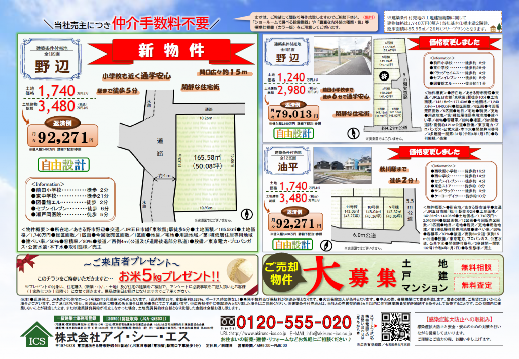 ★建築条件付き売地のご紹介★ Posted on 5月 15, 20236月 5, 2023 by ics ★野辺1区画(建築条件付売地)販売中★ 小学校から徒歩2分!駅まで徒歩5分!閑静な住宅街で子育てしやすい環境です☆ ★駅徒歩10分!閑静な住宅地!野辺6区画! ※6月5日現在、5号棟・6号棟はお申し込みを頂いており、3号棟は契約終了致しました。 ★秋川駅徒歩2分!油平12区画!残り2区画となります! ※9号棟は契約終了致しました。 関連