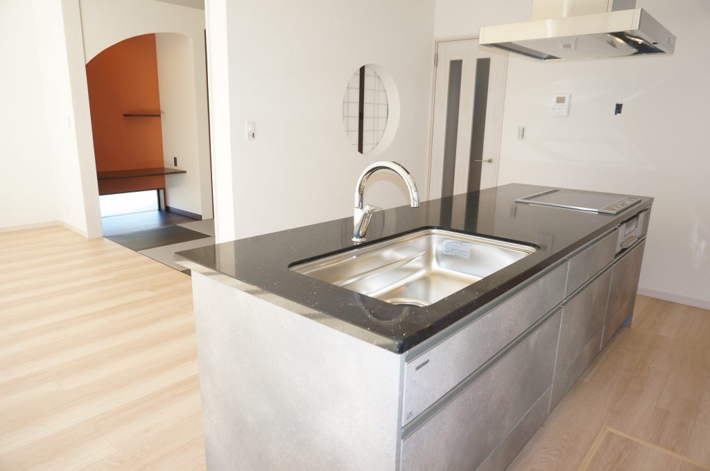 シューズクロークやウォークインクロゼットなど充実した収納。アイランドタイプのキッチンや広めの洗面室など機能性も重視し、光と風が渡るワイドなバルコニーを備えた設計です。 客間などに使える和室には黒やグレーを基調とした正方形のデザイン畳を使用。モダンな雰囲気の和室に、柔らかな光を取り入れる障子とデザイン性の高い丸窓がよく映えます。